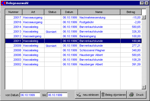 - Schaltfläche neu einlesen: Klicken Sie auf diese Schaltfläche, um die Belege des angegebenen Datumsbereichs einlesen zu lassen. Damit werden auch bereits verbuchte Belege angezeigt.