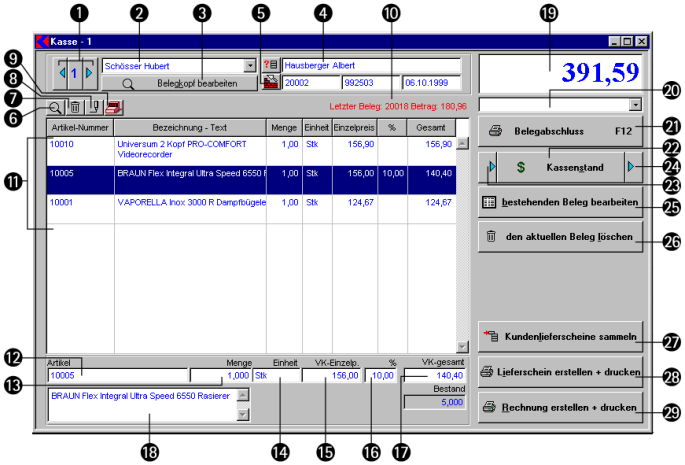 : Mit Klick auf die rechte bzw. die linke Pfeilschaltfläche wechseln Sie zwischen den nicht abgeschlossenen Belegen. (Maximal drei Belege können gleichzeitig in Bearbeitung sein.) Um direkt einen Beleg auszuwählen, können Sie auch mit STRG+1 den ersten Beleg, mit STRG+2, STRG+3 die folgenden Belege aufrufen. In den Kassengrundlagen kann man aber auch die Tasten F5, F6 bzw. F7 für den Belegdirektaufruf festlegen. Siehe Fenster Kassengrundlagen für Kasse.
