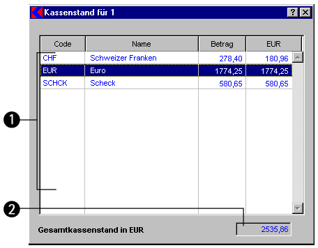 In dieses Fenster gelangen Sie über die Schaltfläche Kassenstand im Fenster Kasse ... oder über die gleichnamige Schaltfläche im Fenster Kassengrundlagen für Kasse ...