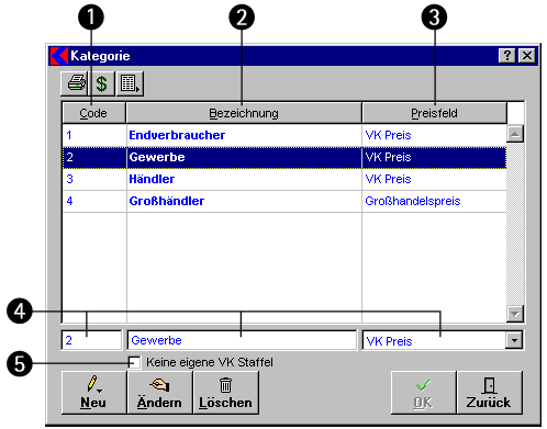 - Hier können Sie nach Klick auf die Schaltfläche Ändern die ausgewählte Kundenkategorie ändern oder nach Klick auf die Schaltfläche Neu eine neue Kundenkategorie erstellen. Dabei können Sie eine Bezeichnung für die Kategorie eingeben und durch Klick auf den Eintrag im Listenfeld ein Preisfeld auswählen.
