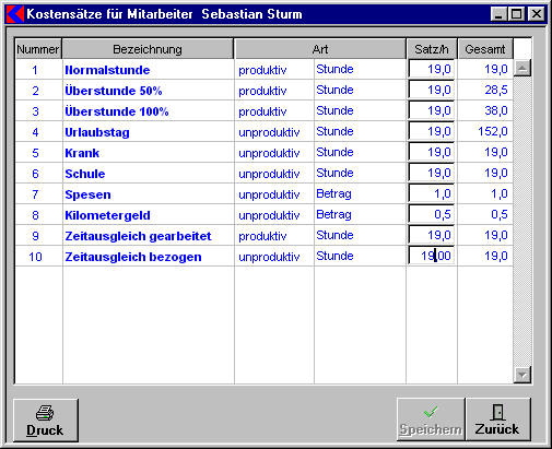 In dieser Maske werden die unterschiedlichen Kostensätze pro Mitarbeiter und Lohnart verwaltet.