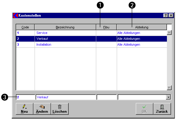 Die Liste im oberen Teil des Fensters zeigt alle vorhandenen Kostenstellen an.