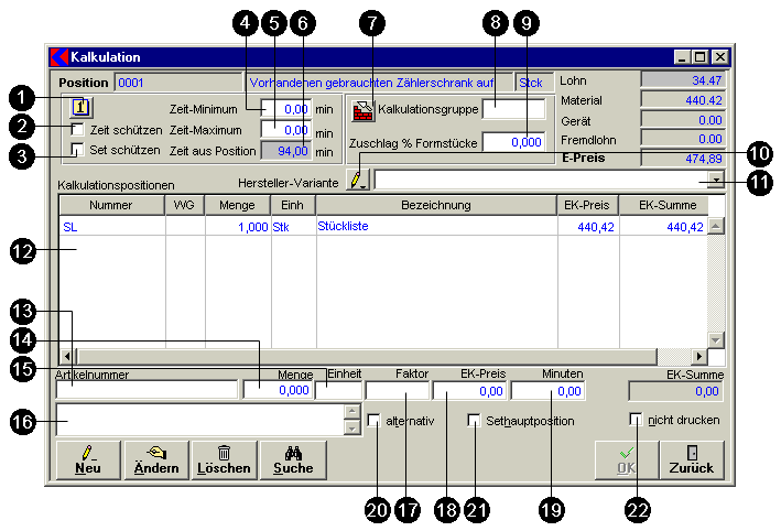 - Eingabefeld Zeit Minimun: kalkulierter minimalster Zeitwert, der für diese Leistungsposition benötigt wird.