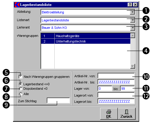 Hier finden Sie Selektionsmöglichkeiten, um den Lagerbestand nach verschiedenen Kriterien auszuwerten und auszudrucken.