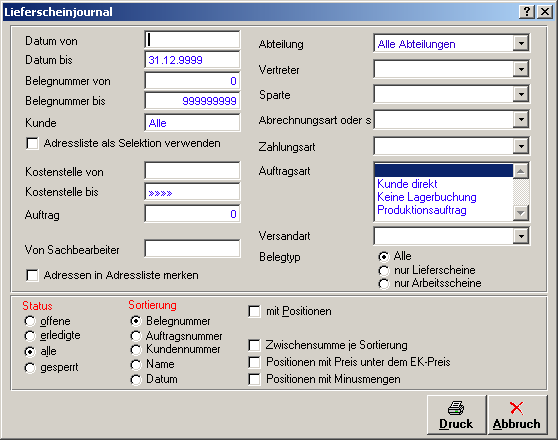 Journale geöffnet. Es dient dem Druck einer Auswahl von Lieferscheinen.