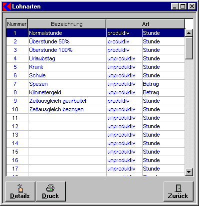 In dieser Maske werden die Lohnarten verwaltet. Diese werden benötigt, um bei der Lohnerfassung verschiedene Arten von Lohn zu unterscheiden.