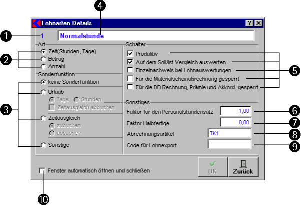 - Das Kontrollkästchen Fenster automatisch öffnen und schließen bewirkt, dass dieses Fenster beim Öffnen des Fensters Lohnarten automatisch mit geöffnet bzw. geschlossen wird.