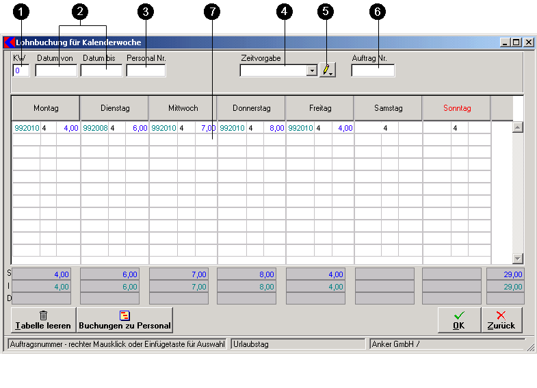 Ziel dieses Fensters:In diesem Fenster sind Personalbezogen die Lohnbuchungen nach einer Zeitschablone und Vorschlagswerte für eine Woche einzugeben.