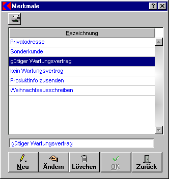 Im Fenster Adressmerkmale können Sie neue Adressmerkmale anlegen bzw. die bereits angelegten Adressmerkmale bearbeiten. Das Zuweisen von Adressmerkmalen ist besonders dann sinnvoll, wenn Sie eine rasche und übersichtliche Unterscheidung der Kunden wünschen. Darüber hinaus hilft Ihnen das Zuweisen von Adressmerkmalen, gesuchte Kundenadressen schneller zu finden, da Sie die Suche durch die Angabe der Adressmerkmale einschränken können.