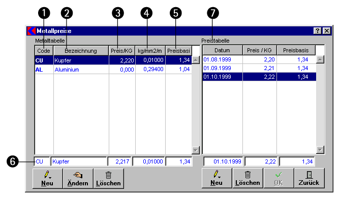 - Preistabelle: Die Preistabelle gibt Ihnen eine Übersicht, wann der Metallpreis zuletzt gepflegt wurde.