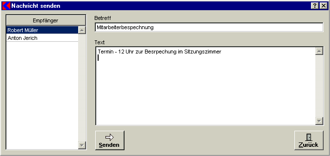 Mit dieser Funktion können Sie Mitarbeitern eine interne Nachricht zusenden. Diese Nachricht empfängt dieser innerhalt von zwei Minuten.