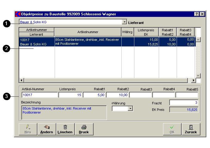 Objektpreise Einkauf sind Preise, die für ein Projekt speziell mit einem Lieferanten verhandelt werden, und nur für diese Baustelle gelten. Diese Einkaufspreise können hier einem Auftrag zugewiesen werden.