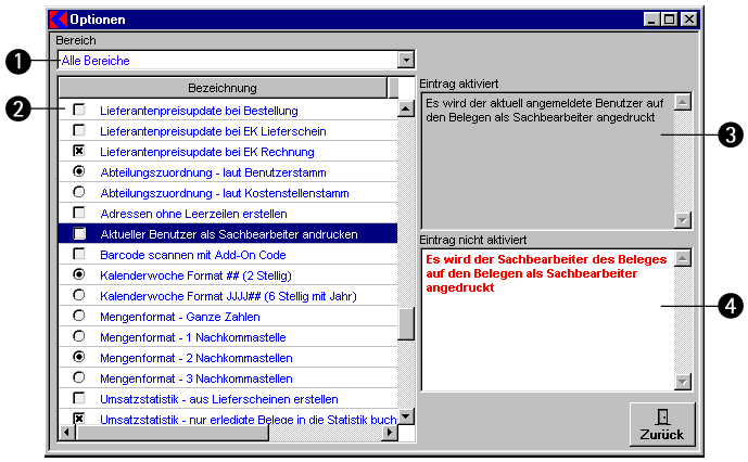- Eintrag aktiviert: Lesen Sie in diesem Feld das Ergebnis, wenn die Option aktiviert ist. Schwarze Schrift auf grauem Hintergrund zeigt an, daß die Option nicht aktiv ist, rote Schrift auf weißem Hintergrund bedeutet, die Option wird ausgeführt.
