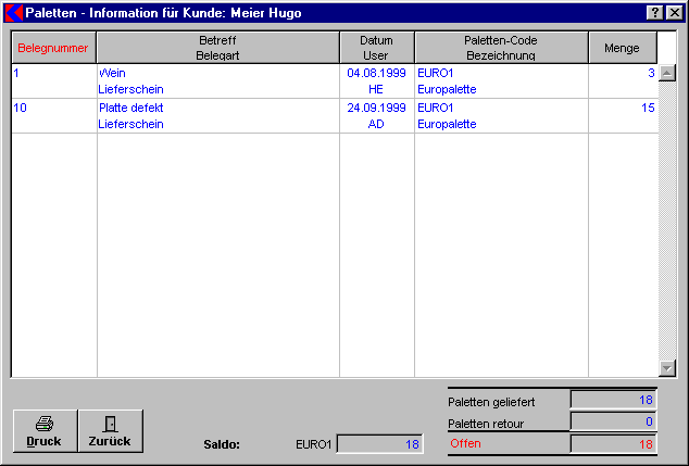 Dieses Fenster ist rein informativ. Es können hier keinerlei Daten geändert, gelöscht oder hinzugefügt werden. Angezeigt werden in diesem Fenster sämtliche Palettenbewegungen, die für einen Kunden vorgenommen wurden.