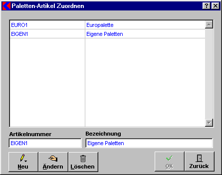 Für bereits angelegte Artikel können Sie hier die Bezeichnungen für eigene Palettenartikel wie auch für Artikel die immer mit Paletten geliefert werden zuordnen. Sie können dann im Adressenstamm unter Paletteninfo den jeweiligen Stand pro Kunde nachsehen.