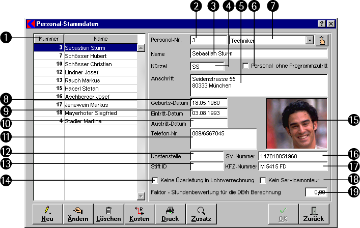 - Die Liste Name zeigt alle angelegten Mitarbeiter an. Für den markierten Eintrag werden in den übrigen Feldern die aktuellen Daten angezeigt.