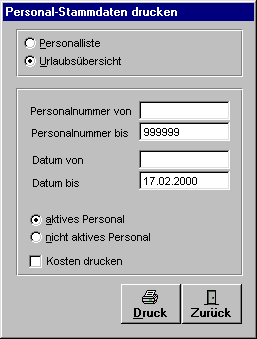 Mit dieser Maske können Sie eine Personalliste wie auch eine Urlaubsübersicht mit allen relevanten Daten des Personals ausdrucken.