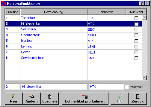 Mit Funktionen werden Mitarbeiter zusammengefasst, die nach außen hin dieselbe Funktion in Ihrem Betrieb ausüben. Das sind z.B. Mitarbeiter, die dem Kunden gegenüber gleich abgerechnet werden.