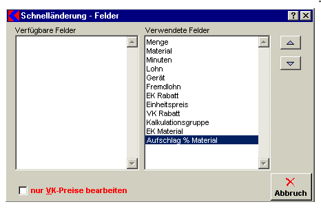 Mit Klick auf die Schaltfläche Felder können in diesem geöffneten Fenster die Felder ausgewählt werden die zur Änderung der Positionen benötigt werden. Mit Doppelklick auf einen Feldnamen können diese in derListe Verwendete Felder übernommen werden und werden für die Änderungen im Fenster Schnelländerung Position angezeigt. Mit dem Pfeiltasten kann die Reihenfolge der verwendeten Felder eingestellt werden. Bei Felder dic nicht mehr benötigt werden sind mit Doppelklick aus der Liste wieder in die verfügbaren Felder zurückzusetzen und werden aus dem Fenster Schnelländerung Position entfernt. Bei Aktivierung des Kontrollkästchens Nur VK Preise bearbeiten kann der Einkaufspreis nicht geändert werden!