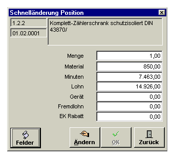 . "Kplus" zeigt Ihnen automatisch die zu der Position angelegten Daten und aktiviert das erste Feld für die Eingabe oder Änderung. Nachdem Sie alle Änderungen vorgenommen haben, bestätigen Sie diese mit einem Klick auf die Shaltfläche Ändern oder gehen Sie einfach mittels der Tabulatortaste weiter. Das Programm springt automatisch auf die nächste in der Liste der Artikel vorhandene Position, ohne das Feld Schnelländerung Position zu schließen. So können Sie schnell und bequem in mehreren Positionen Änderungen vornehmen, ohne immer wieder auf dieselbe Schaltfläche klicken zu müssen. Um das Fenster wieder zu schließen, klicken Sie auf die Schaltfläche Zurück.