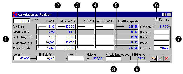 In diesem Fenster wird Ihnen zu einer ausgewählten Position die entsprechende Kalkulation mit allen angelegten Daten gezeigt. Es können in den einzelnen Feldern Änderungen vorgenommen oder neue Kalkulationsdaten hinzugefügt werden. Diese Änderungen beschränken sich auf die Position im Angebot und werden nicht in die Stammdaten übernommen. Um Änderungen vornehmen zu können, klicken Sie mit der Maus in das entsprechende Feld und tragen die gewünschten Daten ein. Bestätigen Sie die Eingabe mit Klick auf die Schaltfläche mit dem grünen Häkchen. Um erneut Daten ändern zu können, klicken Sie auf die Schaltfläche