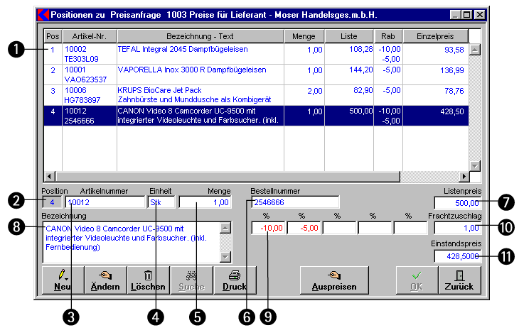 Preisanfrage öffnet sich das Fenster Positionen Preisanfrage mit den Daten zum markierten Beleg.