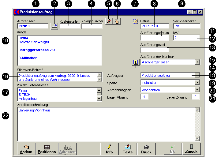 - Eingabefeld Kunde: Bei einem Produktionsauftrag wird die Adresse INTERN (eigene Firmenadresse) mit eigenen Firmendaten eingetragen. Diese Adresse wird bei der ersten Erstellung einens Produktionsauftrages aus den Firmendaten ermittelt und mit der Adressnummer INTERN erstellt.