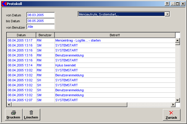 Im Protokoll-Fenster wird ein Protokoll der wichtigsten Schritte erstellt, die mit "Kplus" durchgeführt wurden. Jedem Schritt ist das Datum, die Uhrzeit und über das Kürzel auch die ausführende Person zugeordnet.