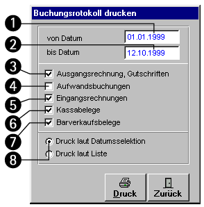 - Wählen Sie durch Klick auf eine der Optionsschaltflächen, ob "Kplus" den Ausdruck des Buchungsprotokolls laut Datumsselektion oder laut Liste starten soll.