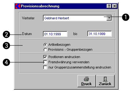 - Wählen Sie aus der Liste den Vertreter, für den die Abrechnung erstellt werden soll. Wenn Sie keinen Vertreter angeben, wird für alle Vertreter in dem gewählten Zeitraum eine Abrechnung gedruckt.