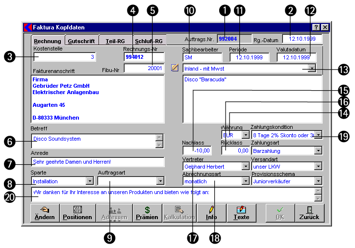 - Bestimmen Sie hier, in welcher Währung (z.B. DM, ATS, ...) die Rechnung erstellt werden soll. Der Vorschlag kommt aus dem Adressenstamm.