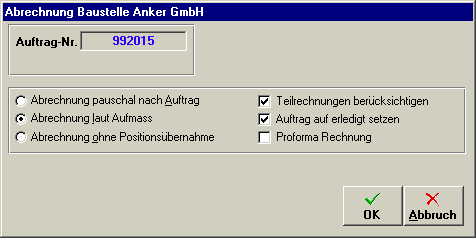 Auftrag und eingegeben Materialscheine sowie Lohnzubuchungen werden für die Abrechnung nicht herangezogen. Es wird ein neuer Beleg erstellt wo eine Pauschale Abrechnung erstellt werden kann. Die aufwände können in der Nachkalkulation und Auswertungen gegenübergestellt werden.
