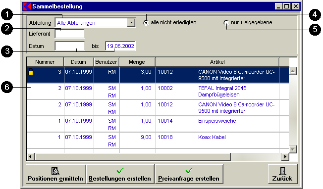 Ziel dieses Fensters:Die Sammelbestellung ist die Ermittlung von Artikeln und Positionen aus offenen Anforderungen. Die Basis dafür sind die Anforderungen. Siehe Anforderungen