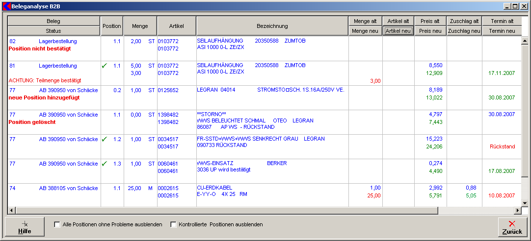 Damit werden nur noch Positionen angezeigt, bei denen irgendwelche Probleme vorhanden sind.