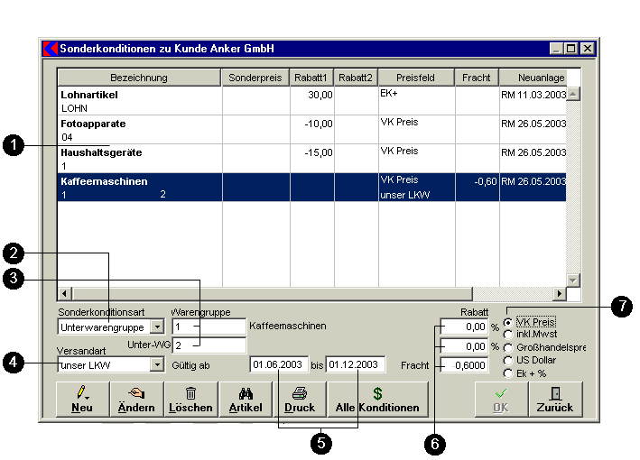 - In diesen Eingabefeldern wird der gewünschte Eintrag des Artikels, Rabattgruppen oder Warengruppe eingetragen die für den Kunden mit Sonderkonditionen hinterlegt werden sollen.