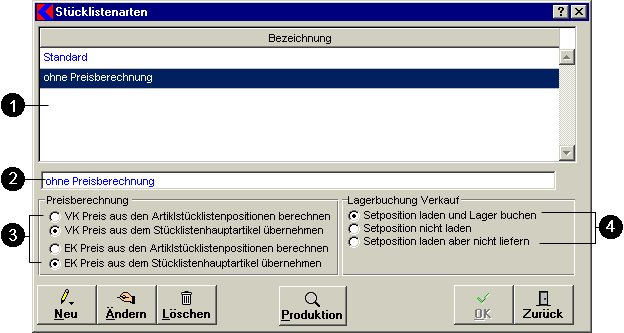 Die Stücklistenarten kommen für die weitere Verwendung in der Auftrags- und Produktionsabwicklung zum Einsatz. Hier sind die Preisdefinition für den Kunden, sowie Sichtbarkeit und Produktionsplanung der Stücklisten eingestellt.