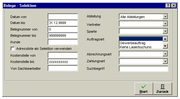 Auftragsart: Hier können Sie eine oder mehrere Auftragsarten selektieren die zur Belegsuche verwendet wird.