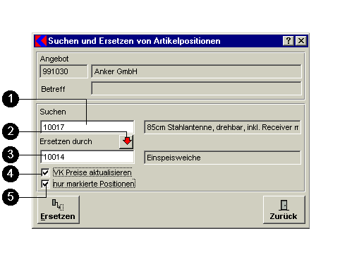 Mit Hilfe dieses Fensters können Sie bestimmte Artikel in einem Beleg schnell und unkompliziert durch einen anderen Artikel ersetzen.