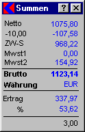 In diesem Feld werden von "Kplus" je nach Belegart alle Betragssummen der Positionen eines Belegs aufgerechnet. Das Feld kann von Belegart zu Belegart im Aussehen variieren, die Aussage im Feld bleibt aber die gleiche. Es können keine Einträge oder Änderungen vorgenommen werden.