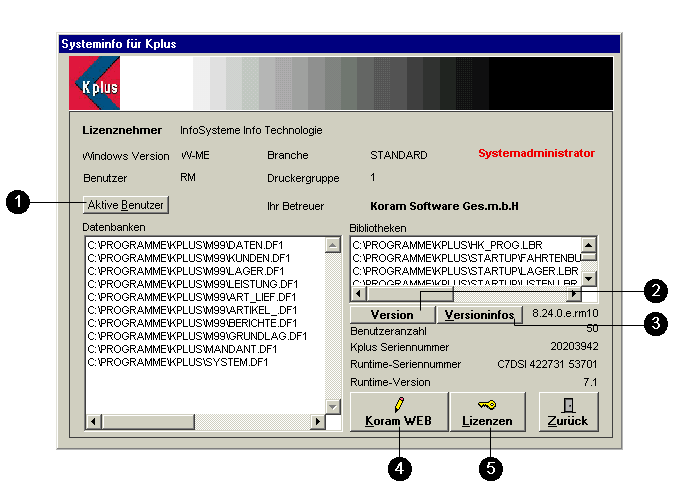 Neben der Einsicht in die Systeminformationen zu "Kplus" können Sie hier folgendes tun: