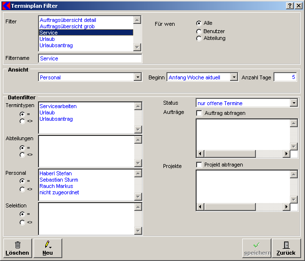 - nur offene Termine: Nur Termine mit dem Status offen und in arbeit werden angezeigt