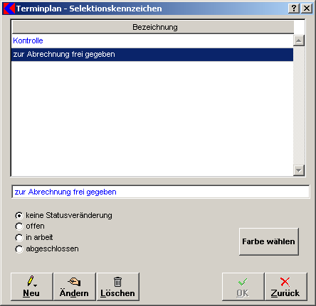 - in arbeit: Wenn Sie einem Termin dieses Selektionskennzeichen zuordnen wird der Status von dem Termin auf in arbeit gesetzt