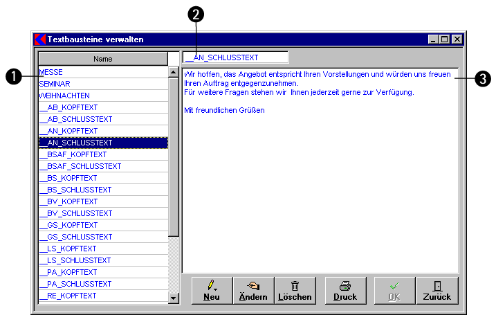 Textbausteine. In diesem Fenster können Sie sehen, welcher Textbaustein welche Formulierung enthält und neue Textbausteine erstellen. Textbausteine können in allen Belegen als Kopfzeilen, Betreffzeilen und Schlusstexte verwendet werden sowie zum Füllen von Feldern (z.B. Positionen eintragen). Siehe auch Kopf- und Schlusstexte und die Kopfdaten zu den einzelnen Belegen in Einkauf und Verkauf.