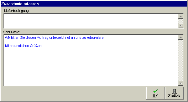 Die Eingabe von Lieferbedingungen und Schlusstexten zum jeweiligen Beleg.