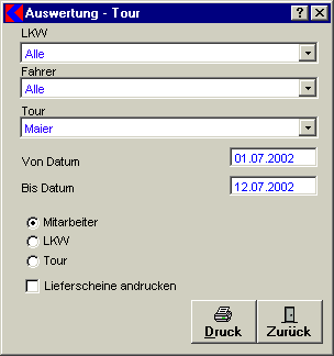 In diesem Fenster ist eine Auswertung nach den Selektionskriterien des Fahrzeuges, Fahrers und der Tour zu erstellen.