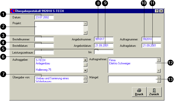 - Eingabefeld: Mängel Hier sind die Mängel, Reklamationen des Kunden einzutragen.