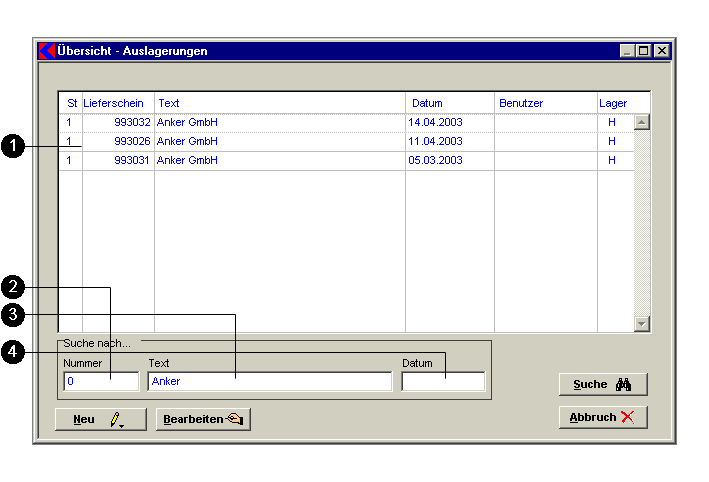 Die Auslagerungen können nach der Nummer, Text oder Datum gesucht und gelistet werden.