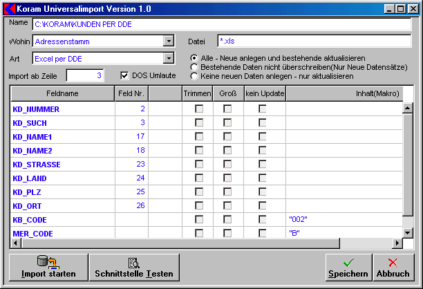 - Excel per DDE: Diese Einstellung ist für den Import aus einer geöffneten MS-Exceltabelle.