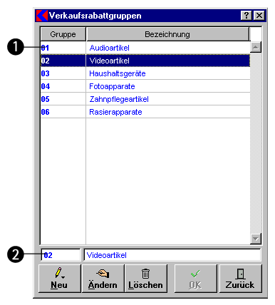 - Auswahlliste: In der Liste werden Ihnen alle angelegten Verkaufsrabattgruppen angezeigt. Wählen Sie hier einen Eintrag aus, um Änderungen an einer Gruppe vorzunehmen oder einen Eintrag zu löschen. Mit Klick auf die Spaltenbezeichnungen können Sie die Einträge nach Gruppe oder Bezeichnung sortieren.