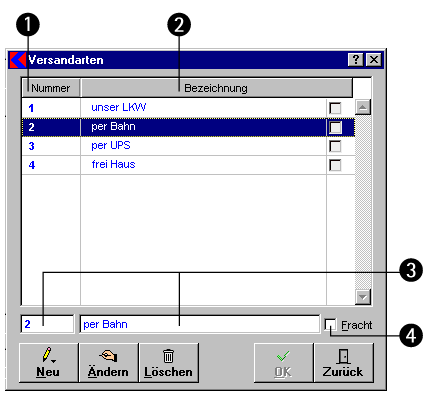 In dieser Maske legen Sie eine Liste für verschiedene Versandarten an oder bearbeiten bereits vorhandene. Die Versandart zeigt bei den Adressen an, auf welche Weise zu versendenden Artikel zu den Kunden gelangen. Die Daten werden den Zusatzdaten zu einer Adresse verwendet.
